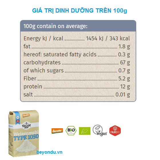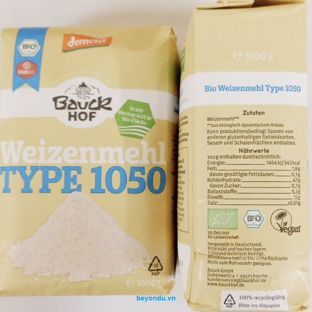 Bột mì hữu cơ Bauckhof type 1050 là bột mì hữu cơ cao cấp có chứng nhận hữu cơ châu Âu và chứng nhận Demeter từ thương hiệu Bauckhof tại Đức. Bột mì hữu cơ Bauckhof loại 1050 là lựa chọn tuyệt vời để làm bánh mì, bánh cuốn, pizza, bánh ngọt, bánh quy, pancakes..., lý tưởng để làm bánh có màu xám nâu hoặc mix (trộn) chung với loại bột mì hữu cơ khác để tạo các loại bánh có kết cấu đa dạng, thú vị hơn.