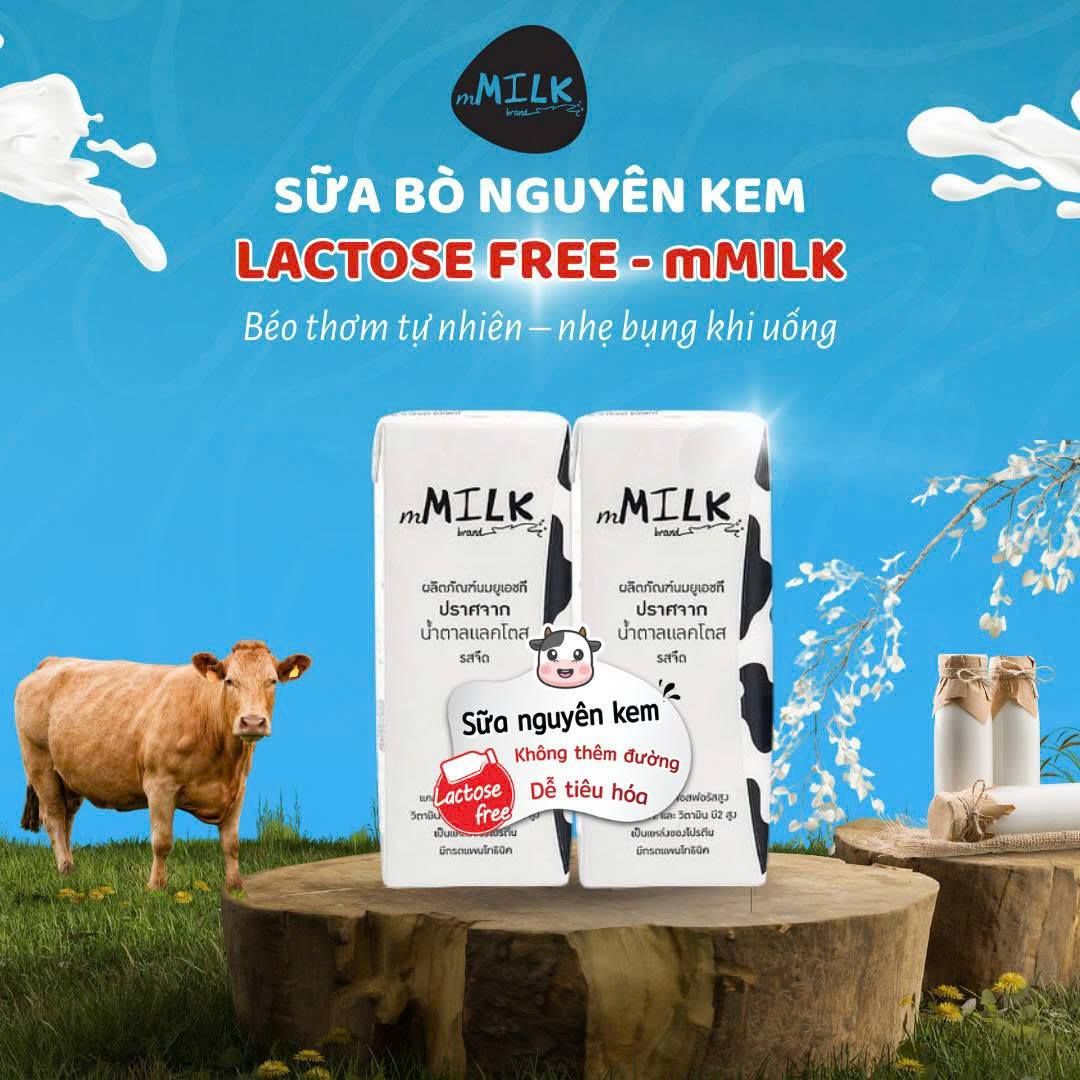 Sữa bò nguyên kem không lactose mMilk 180ml là sữa bò lactose free được sản xuất tại Thái Lan từ thương hiệu mMilk, đây là lựa chọn để dùng cho người lớn và em bé trên 1 tuổi . Sản phẩm được bán theo lốc 2 hộp (như hình).